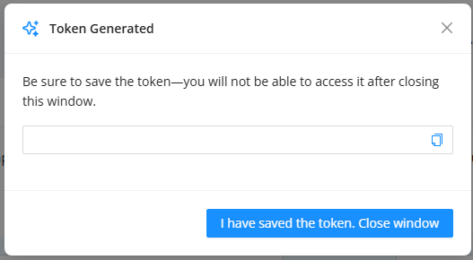 1. Copy the generated token. After closing the window, it is not possible to copy the token again, so be sure to save the generated token.