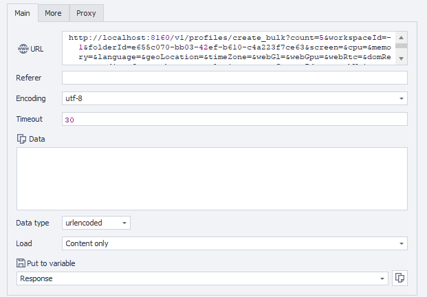 RequestUri = new Uri("http://localhost:8160/v1/profiles/create_bulk?count=&workspaceId=-1&folderId=&screen=&cpu=&memory=&language=&geoLocation=&timeZone=&webGl=&webGpu=&webRtc=&domRect=&audio=&fonts=&battery=&plugins=&proxyServerId=&speechVoices=&tags="),