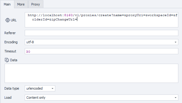 curl 'http://localhost:8160/v1/proxies/create?name=&proxyUri=&workspaceId=&folderId=&ipChangeUrl=' \